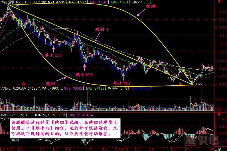 常見的是“跌斜下”線、“跌拱”線和“跌凹”線三種:漲跌五勢二: