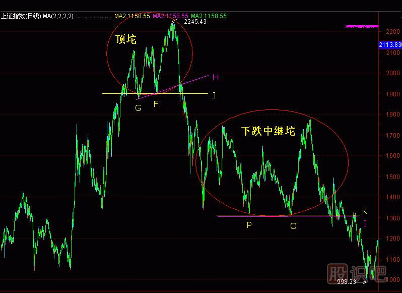 (圖286-5)是上證指數(shù)從2245點跌到998點的日K線圖。 “頂坨”的低點F作“水平攔截線”,得到J點攔截點。另一個低點G與F作“斜上攔截線”,得到H攔截點。這兩條線就是“筷子線”。當(dāng)上證指數(shù)從“頂坨”跌破H點后,發(fā)生了“坨突破”,這時應(yīng)準(zhǔn)備清倉出貨。當(dāng)上證指數(shù)跌破J點后,意味�派現(xiàn)ぶ甘黃�“筷子線”的支撐,向下破位。破位后的跌勢往往是勢不可擋,一泄一大截。“頂坨”向下破位這段行情,是我們必須躲避的行情,否則損失是巨大的。