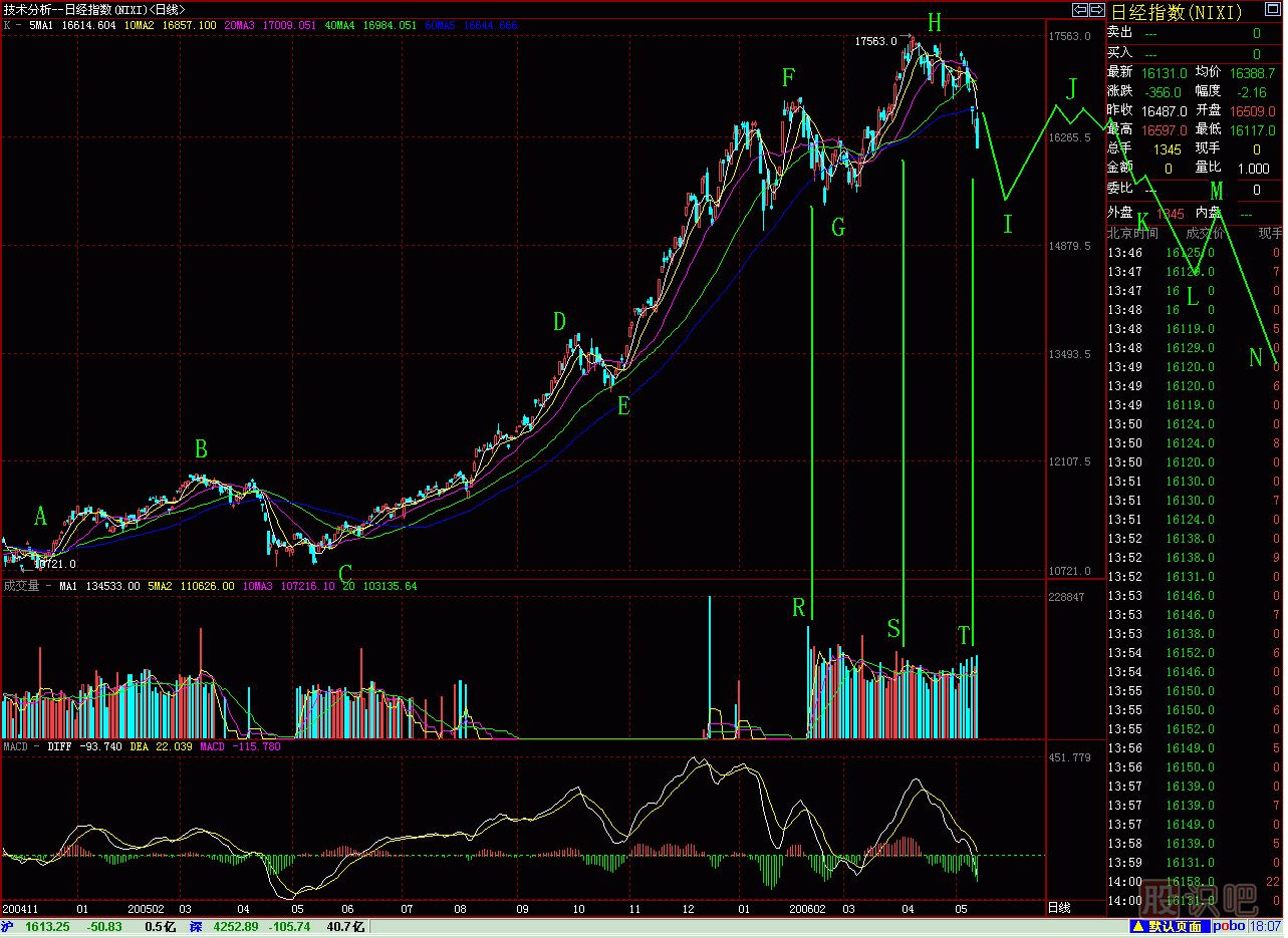 (圖266-3)2006年7月21日檢查預測效果時,日經指數(shù)(NIXI)的日K線圖。其中“大刀砍”和“斷頭鍘刀”的形態(tài)非常標準,實際走勢與(圖266-2)中的H-I-J預測基本吻合,現(xiàn)在已走K,估計未來還會沿著L-M-N的預測運行。