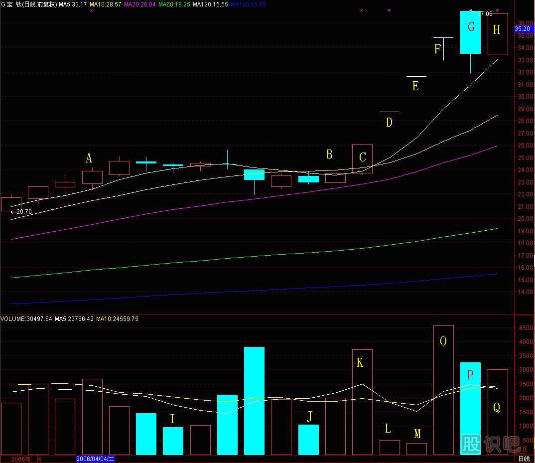 (圖259-1)的600456 G寶鈦是去年進(jìn)入廣通沙盤(pán)的沙盤(pán)股,一直在漲。前幾天是四個(gè)漲停板,其中兩個(gè)是空心漲停板,昨天還創(chuàng)了上市以來(lái)的新高,后市怎么看?對(duì)于一個(gè)長(zhǎng)期上漲的個(gè)股,形成頭部會(huì)有一個(gè)過(guò)程,這個(gè)過(guò)程沒(méi)出現(xiàn),頭部就不成立,所以先別擔(dān)心這是頭部,即便這是頭部,你也能在頭部區(qū)間的慣性沖高時(shí)出逃。