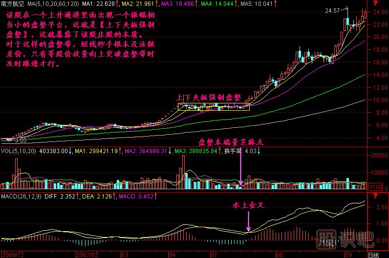 小結(jié):在現(xiàn)階段,我們的股市還很年輕,既然年輕,就避免不了莊家主力對股價(jià)的操控行為,如果你發(fā)現(xiàn)一只股票在相對低位出現(xiàn)上下夾板強(qiáng)制盤整的走勢,一般是操盤手受到某種指令的操控這樣做的,這就說明這個(gè)股票里面有莊家,那么一旦股價(jià)在后期向上突破,則是一個(gè)參與的機(jī)會(huì)。當(dāng)然這要剔除那些已經(jīng)漲幅巨大、進(jìn)入高空飛行的股票,那樣的股票在高位走的是出貨拉鏈,和本節(jié)的內(nèi)容是不同的,性質(zhì)不一樣。