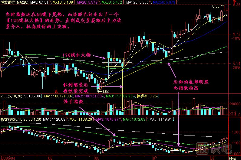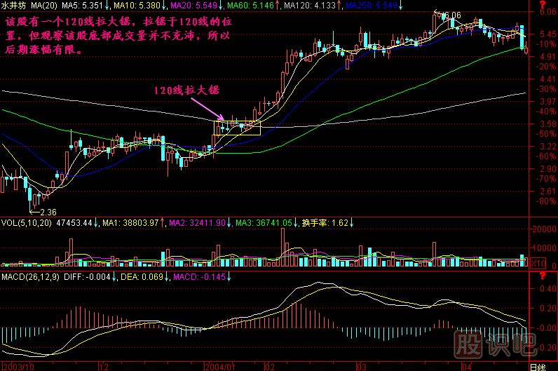 第一個(gè)原因是要有一定時(shí)間,第二個(gè)原因要往下砸盤,第三個(gè)原因是要往上拉,這樣就形成了圍繞120線的一個(gè)爭奪。爭奪的位置為什么會(huì)恰恰好在120線上下呢?這只是一個(gè)巧合。一般情況下,我們把一個(gè)月作為20個(gè)交易日,120個(gè)交易日就是半年的時(shí)間,半年的平均成本都在這里,所以最容易在這一帶形成拉大據(jù)。當(dāng)然在爭奪120線也是一個(gè)習(xí)慣,拉大鋸位置有時(shí)候也會(huì)拉偏,如果拉大鋸是在120線的上方,那就是強(qiáng)勢(shì)拉大據(jù),叫120上拉大鋸,位置往下一點(diǎn),就叫120下拉大鋸,走勢(shì)相對(duì)弱一點(diǎn)。