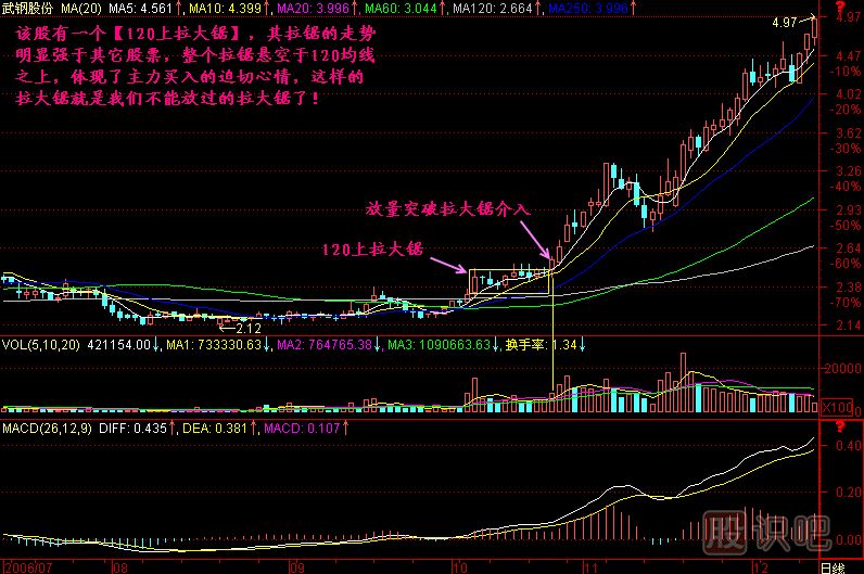 從強(qiáng)弱度來說,我們最看好的是120上拉大鋸,因?yàn)樗砹酥髁I入的迫切心情,這樣的拉鋸之后一般漲幅都大些,而對(duì)于120線拉大鋸,則體現(xiàn)了主力的買入興趣沒有前者強(qiáng),所以如果有兩個(gè)股票,一個(gè)是120上拉大據(jù),另一個(gè)是120線拉大鋸的話,我們一般挑選120上拉大鋸的股票。
