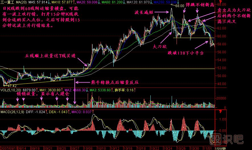 如此一來,我們就分析出了三個賣出點,分別是f點——小壓、g點——進(jìn)入2&3區(qū)間、h點——2-3區(qū)間120線下小平臺。當(dāng)然,我們對這三個賣出點沒有細(xì)分,如果細(xì)分它里邊還有一些細(xì)小的動作,例如在2&3區(qū)間內(nèi)還有回光返照、頭上長毛(況且這個毛還沒有長出來)等,這就分得很細(xì)很細(xì)了,一般粗糙點也就行了,因為這是15分鐘K線圖,本身就是比較精細(xì)了,你講得粗一點,也無所謂,在一個相當(dāng)精密敏感的K線上,線條稍粗一點,有利于買賣。