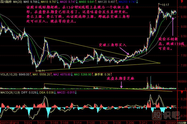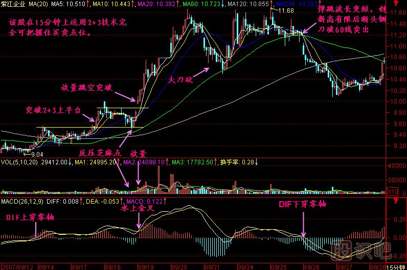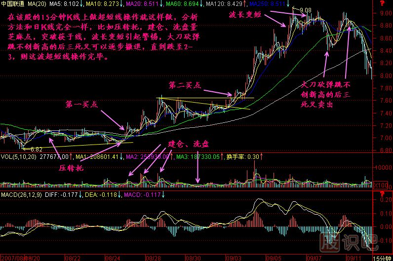 小結(jié):精確的超短線盈利買賣點是建立在對廣通各種單一技術(shù)的熟練運用上的,只要學(xué)好了各種單一技術(shù),并搞清楚每一個單一技術(shù)的適用位置,就可以在15分鐘K線圖上運用2+3均線系統(tǒng)技術(shù)操作了。