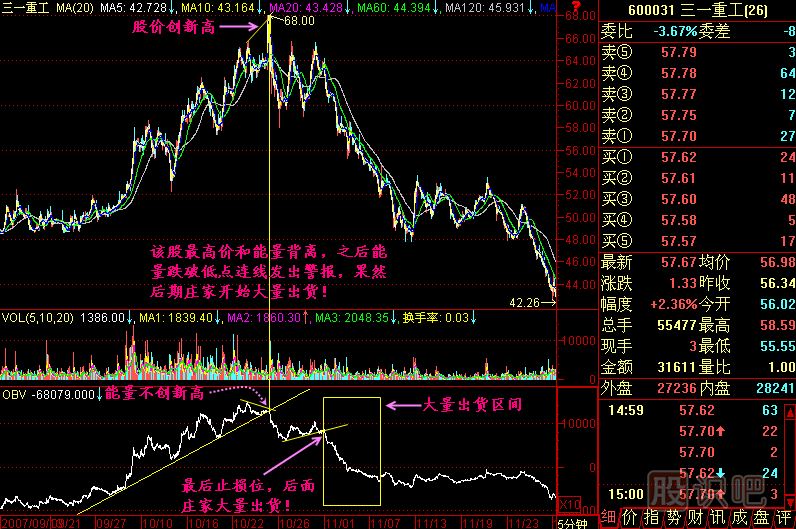出現(xiàn)這種OBV急速下跌,陰量不斷地涌出來(lái),而股價(jià)并沒(méi)有大幅下跌的時(shí)候,就要引起警惕,這是莊家一邊維持著股價(jià),一邊加快速度出貨,回檔是難免的。