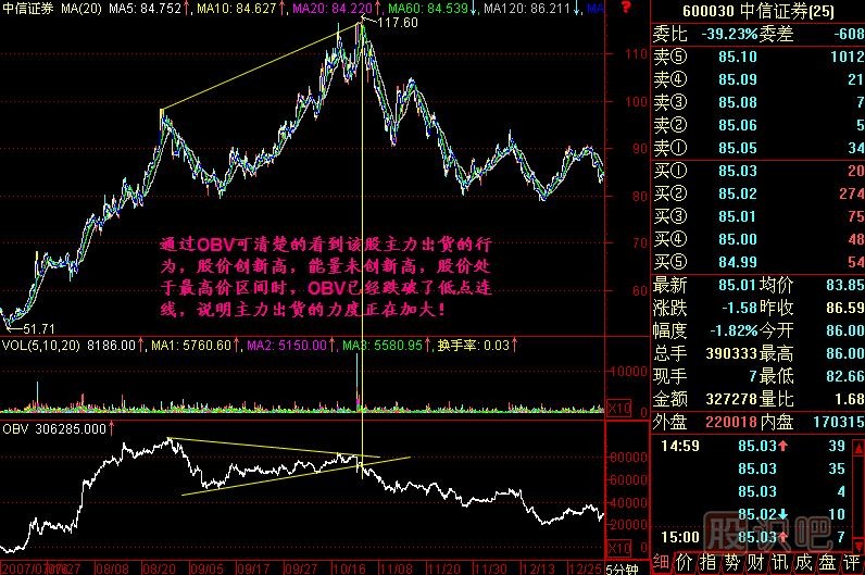 晚上剛剛收到一個(gè)Email,我們?cè)谌珖?guó)的學(xué)員很多,對(duì)一些有典型意義的問(wèn)題我們現(xiàn)在做一個(gè)統(tǒng)一回答。他問(wèn)中信證券是不是在出貨?有這個(gè)感覺(jué)當(dāng)然很好。為了回答這個(gè)問(wèn)題,我們把中信證券5分鐘K線(xiàn)調(diào)出來(lái),然后分析下邊的OBV指標(biāo),見(jiàn)(圖204-1)所示。