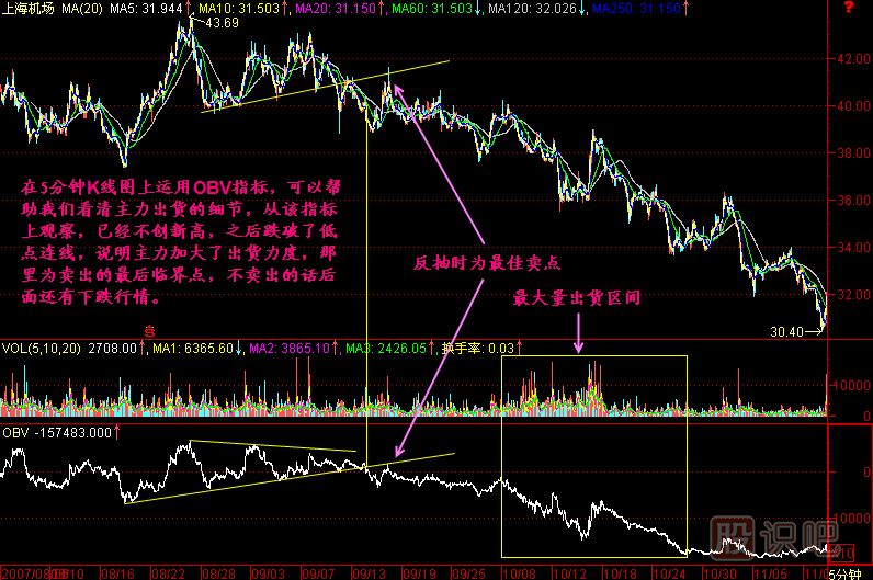 在緩慢派發(fā)時(shí),表面上看,股價(jià)可能是創(chuàng)新高乏力,但如果查看5分鐘OBV能量潮,會(huì)發(fā)現(xiàn)能量潮已經(jīng)不能創(chuàng)新高了,而股價(jià)還在創(chuàng)新高。而當(dāng)能量潮跌破低點(diǎn)連線(xiàn)時(shí),就是莊家從維護(hù)股價(jià)出貨的階段,轉(zhuǎn)變到全力出貨的階段那個(gè)臨界點(diǎn),那里就是我們必須撤退的位置,如果你不撤退,小則要吃一個(gè)回檔,損失其它黑馬機(jī)會(huì),大的話(huà)可能就是整個(gè)股價(jià)的頭部,很可能因此就套牢了。