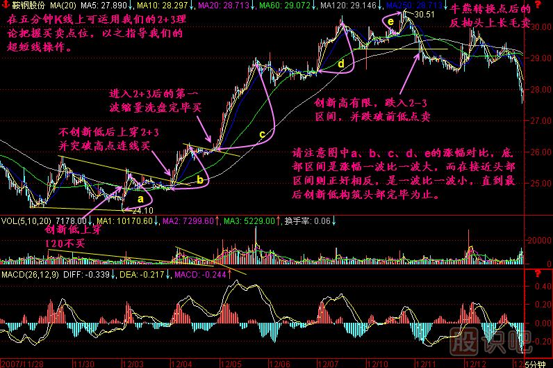 我們要看清楚a點(diǎn),120下小平臺可能就要出現(xiàn)了,現(xiàn)在就要退出來,b這兒是我們切入的一個很好點(diǎn)位。我們上一次從日k線圖上面的底線切入,就是2.78元,那個時候是三個瞄準(zhǔn)鏡,一號炮手、二號炮手、三號炮手,全部瞄準(zhǔn)以后打進(jìn)去!從五分鐘K線圖上價位甚至可以再低一點(diǎn),不過沒什么意義,幾分錢也就算了。在b點(diǎn)可以切入,同樣遵循著2+3理論,就是收集籌碼,抬起來,然后橫向震蕩,把籌碼洗干凈,在c點(diǎn)把籌碼洗得干干凈凈,為后面的爆發(fā)準(zhǔn)備好條件。所以我們說,股價當(dāng)時沿著下降趨勢線慢慢下滑,在五分鐘圖上就是沿著這條高點(diǎn)連線下滑,直到把量洗得干干凈凈,這在五分鐘線上看得更清楚,洗到了最沒有量時,實(shí)際上機(jī)會就來了。