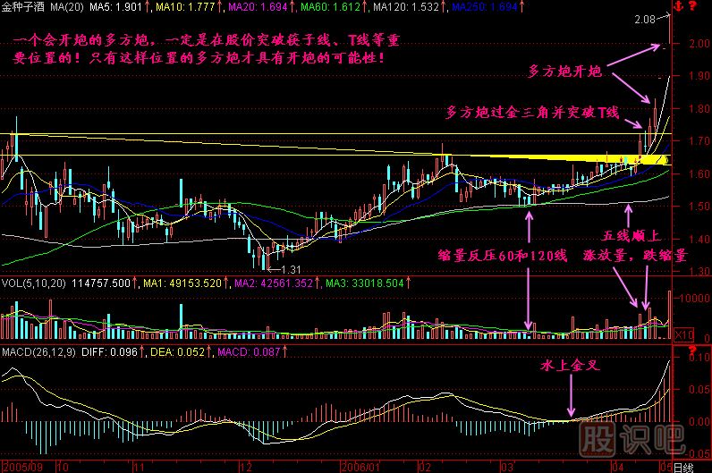 多方炮后面開炮往往有兩種情況:一種是早晨開盤后還不覺得怎樣,突然之間就拉起來;還有一種是直接跳空高開,那就是巨量跳空,回檔買進(jìn)!這個圖形還有一個特殊性,就是一個長期的三角形盤整帶被多方炮突破,這個時候它推出去的力量相當(dāng)大,這是一種噴發(fā)性的力量,因?yàn)槟敲撮L時間以來股價一直受到這個三角形制約,憋得很厲害,憋得它最后沒有路好走了,要么往上突破,要么往下突破??墒俏覀冎?,《十九強(qiáng)》跟蹤一汽轎車已經(jīng)有兩年多了,我們一直說它是莊股,大家說是不是?我們公開在中央電視臺講過,在《十九強(qiáng)技術(shù)》講座里講過,在網(wǎng)站上也講過,就是講一汽轎車是莊股。為什么?因?yàn)樗凇妒艔?qiáng)》里面表現(xiàn)得非常強(qiáng)烈,經(jīng)常處于《十九強(qiáng)》第一名。既然它是莊股要做上去,那就決定了它要么不突破,要突破就是往上突破,不可能往下突破。