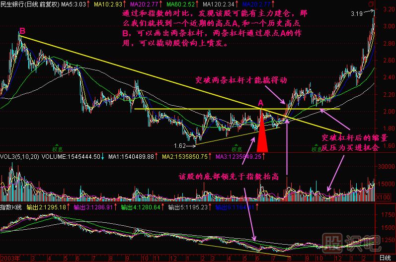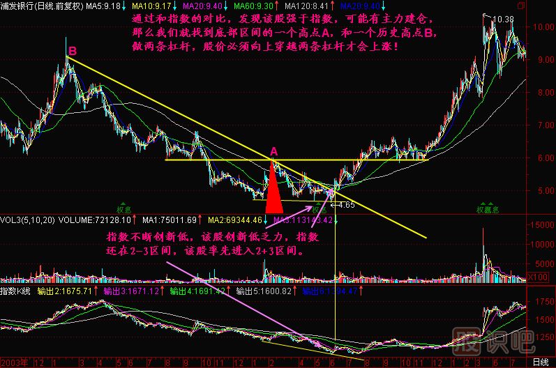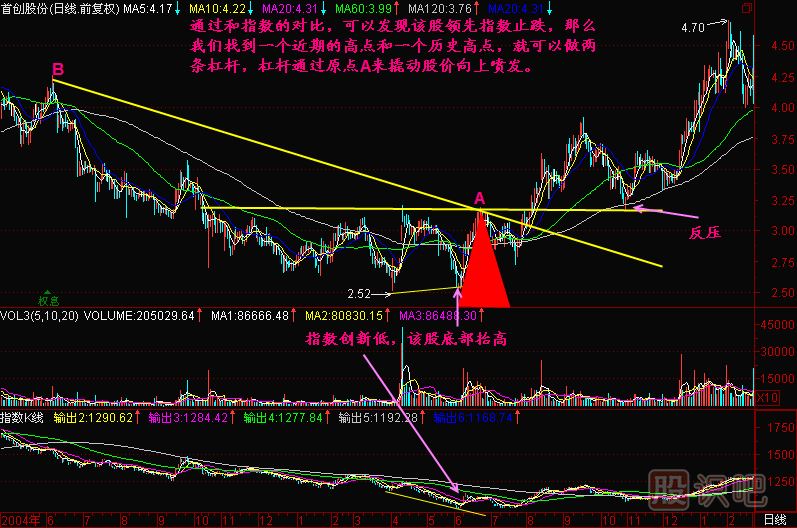 小結(jié):在指數(shù)長(zhǎng)期下跌后,我們可以通過(guò)尋找那些領(lǐng)先于指數(shù)底部抬高的個(gè)股,這些個(gè)股往往是主力資金提前布局的股票,找到這樣的股票以后,我們就找到它底部打樁區(qū)間的一個(gè)高點(diǎn)做為原點(diǎn),通過(guò)這個(gè)原點(diǎn)與一個(gè)近期的歷史高點(diǎn)做線,得到一根杠桿,另外一根杠桿就是這個(gè)原點(diǎn)底部區(qū)間的高點(diǎn)連線或者就是通過(guò)它做的水平線。