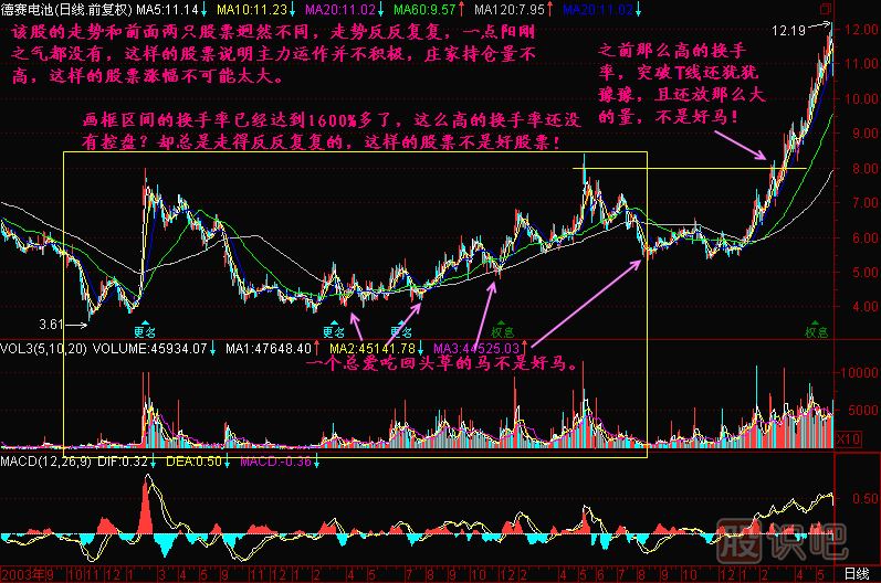 小結(jié):一只好的股票,在大盤開始上漲之后,它應該表現(xiàn)為好馬不吃回頭草,只有這樣的股票才說明莊家建倉積極,每突破一條防線之后,莊家就舍不得再讓股價回到該防線之下了,如果能夠回下來,就意味著莊家愿意讓散戶來逢低吸納,這就從一個側(cè)面說明幾個問題,起碼說明莊家決心不夠強,或者說明莊家的資金實力有限,還可能是該股基本面有某種不確定性,使得莊家比較猶豫,還可能是多個主力在對弈,這樣的股票就不可能是好股票!