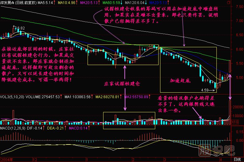 小結(jié):加速趕底是莊家建倉常用的招數(shù),莊家預(yù)先收集一點籌碼,之后可以用部分籌碼來砸盤,制造加速趕底的走勢,加速趕底之前往往有一個小平臺橫盤,散戶原本還打算持股觀望的,但突然向下快速突破,散戶終于在最后的恐慌中拋出了籌碼。