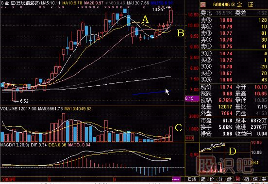 股票看盤軟件來講壓瓦解圖283-1(圖283-1)G金證日K線圖上A處有個(gè)“壓”,“壓”對(duì)于股價(jià)繼續(xù)上升有壓力,怎樣才能瓦解這個(gè)&ld...