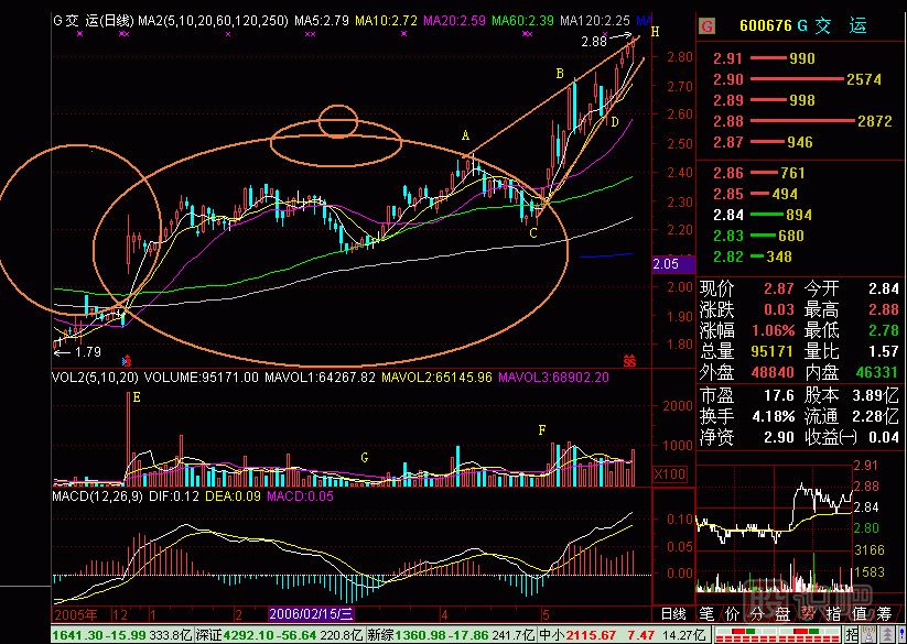 周線看盤技巧初談茶壺圖276-1(圖276-1)E點(diǎn)是股改缺口,當(dāng)天換手16.95%,漲16.36%,明顯有資金介入,以后連續(xù)放量,股價(jià)溫和爬高,這也是收集籌碼的跡象。G點(diǎn)是洗...