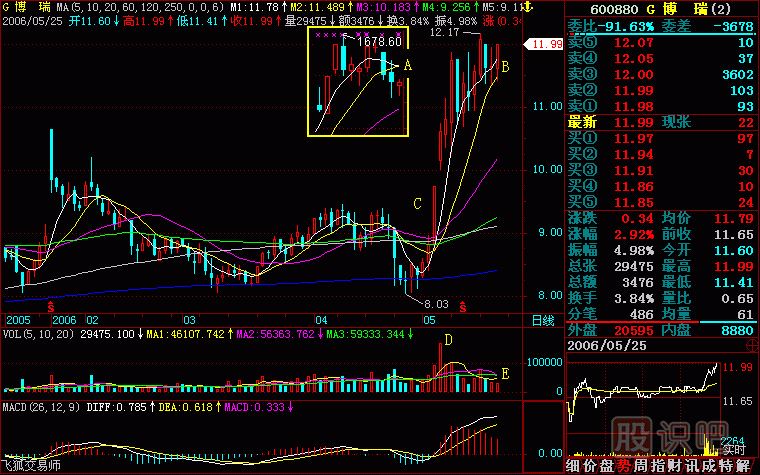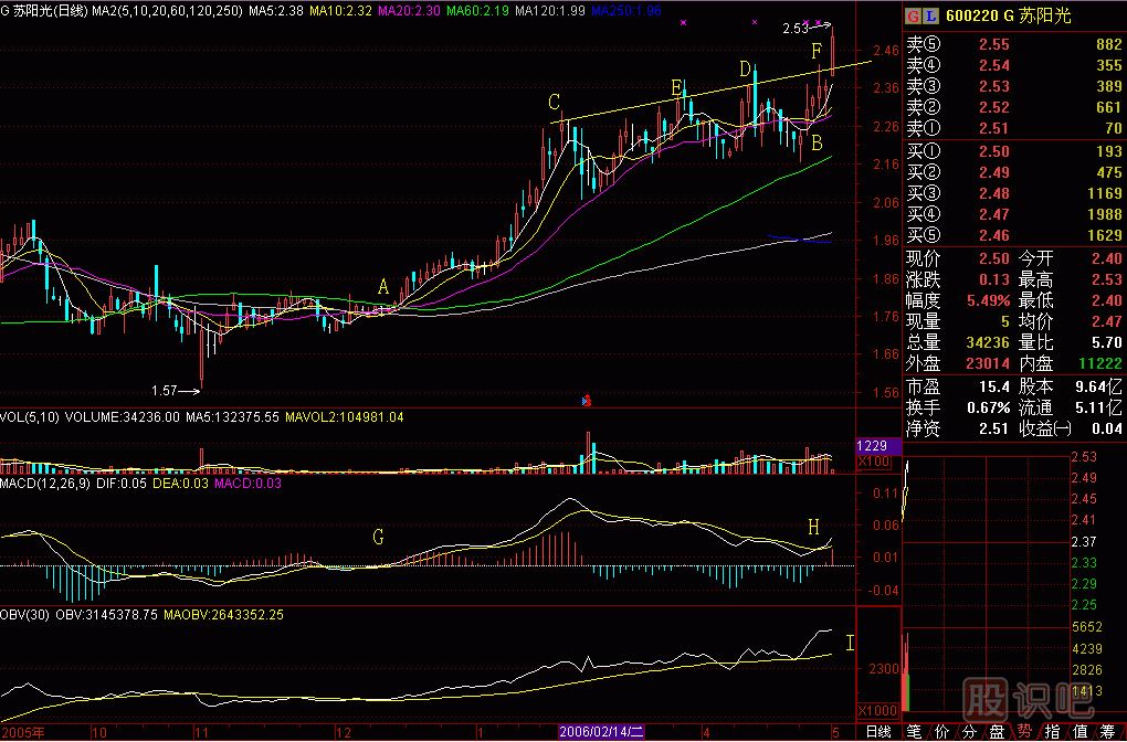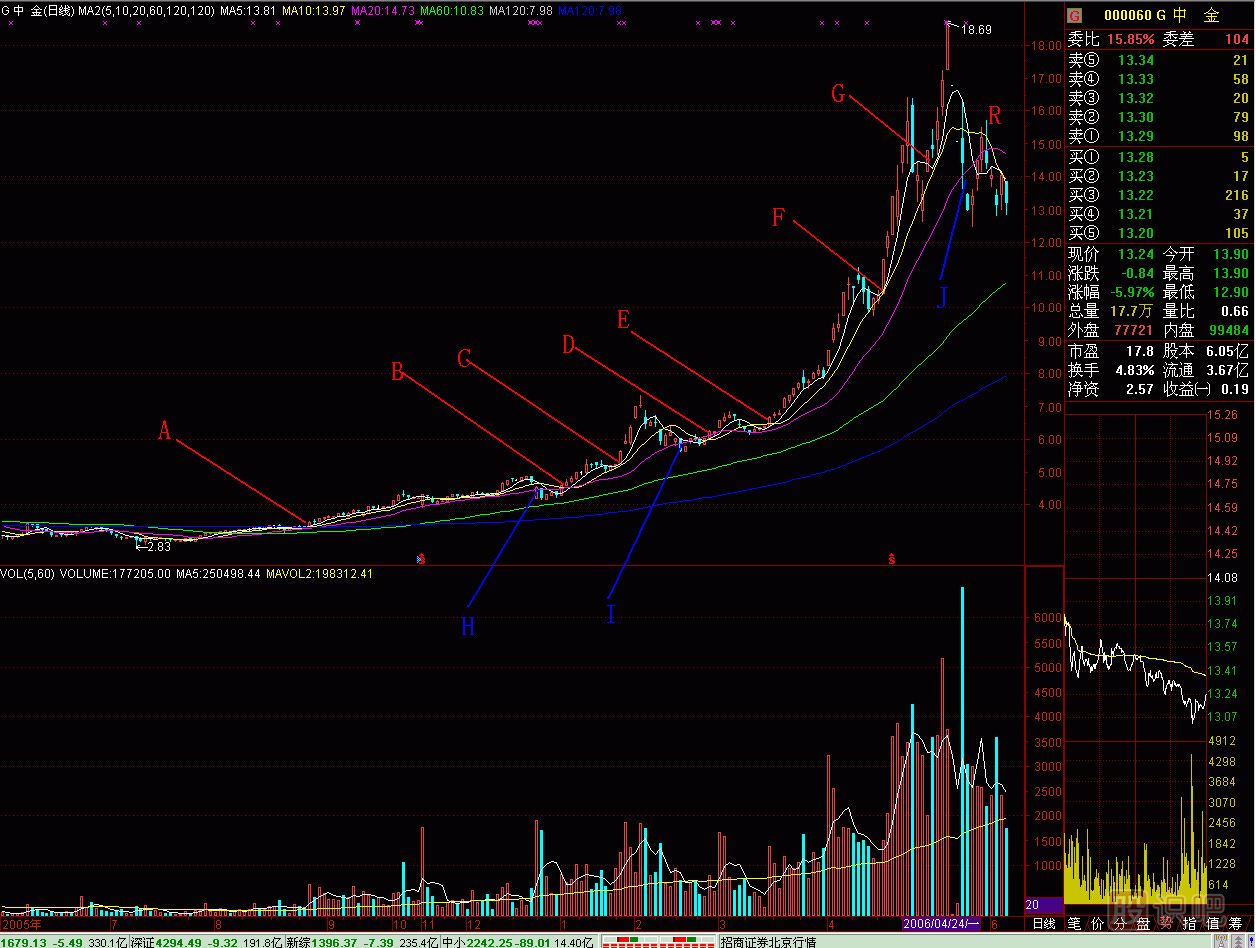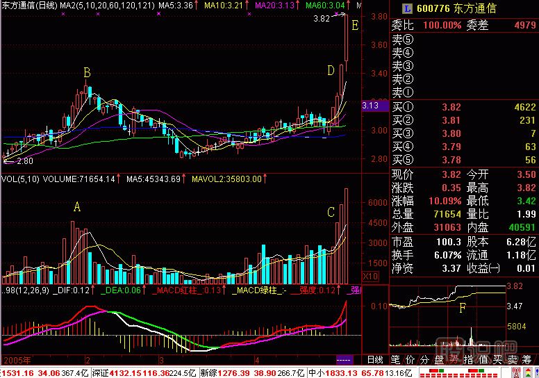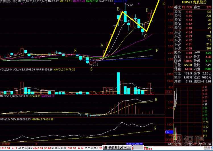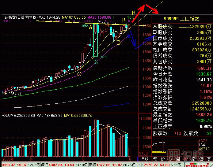 茶壺圖276-1(圖276-1)E點是股改缺口,當天換手16.95%,漲16.36%,明顯有資金介入,以后連續(xù)放量,股價溫和爬高,這也是收集籌碼的跡象。G點是洗...