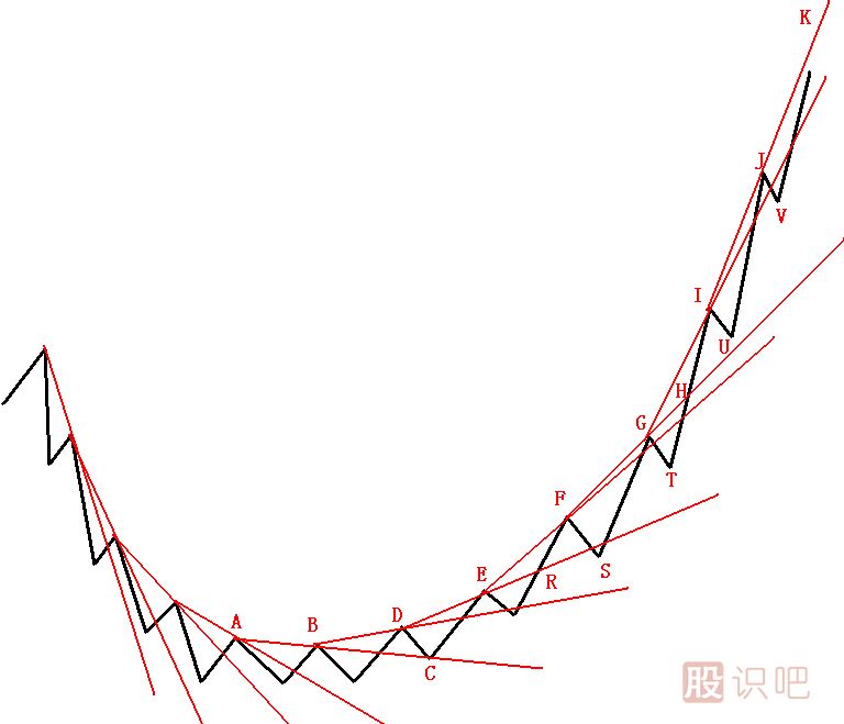 內徑線圖261-1把(圖261-1)中每兩個相鄰的股價高點都畫一條直線,就是內徑線。有意義嗎?有:1、前直線往往是后一回檔的底部支撐,跌破的概...