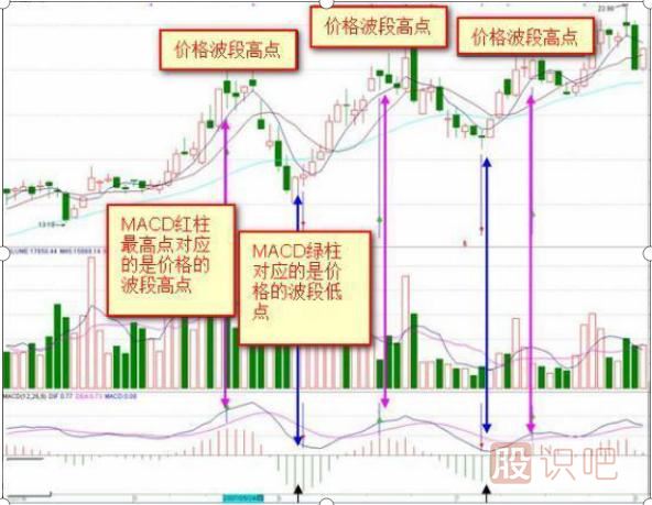 價格下跌,MACD綠柱逐步放大,當綠柱出現(xiàn)最高點時(最長綠柱),價格也往往對應(yīng)出現(xiàn)波段低點;(背離時不會對應(yīng))