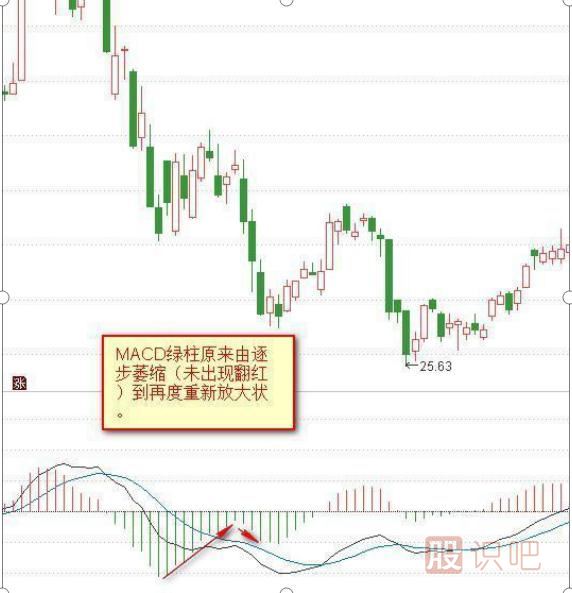在實踐中,MACD綠柱可以連續(xù)出現(xiàn)兩波甚至三波連續(xù)性翻綠,這是價格弱勢連續(xù)下跌的結(jié)果。操作上我們必須小心這樣的走勢。在價格出現(xiàn)止跌小幅反彈或震蕩再重新下跌時,MACD綠柱原來由逐步萎縮(未出現(xiàn)翻紅)到又重新放大,這是一個賣出信號。價格將進一步下跌,之前的買入操作必須止損。