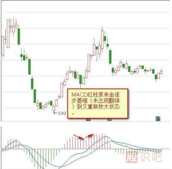 在實踐中,MACD紅柱可以連續(xù)出現(xiàn)兩波甚至三波連續(xù)性翻紅,這是價格強勢連續(xù)上升的結(jié)果。操作上我們最期待這樣的走勢。在價格出現(xiàn)小幅調(diào)整或震蕩再重新拉升時,MACD紅柱原來由逐步萎縮(未出現(xiàn)翻綠)到又重新放大,這是一個買入信號。