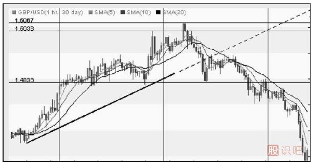 我們注意到,匯價(jià)果真下跌,至1.503 6附近,確認(rèn)了2B法則。但是2B法則引發(fā)的是自1.503 6開始的短期下跌走勢(短期反轉(zhuǎn)走勢),具體到匯價(jià)自上升趨勢線起始水平開始的主要上升趨勢是否反轉(zhuǎn),則要進(jìn)一步分析。