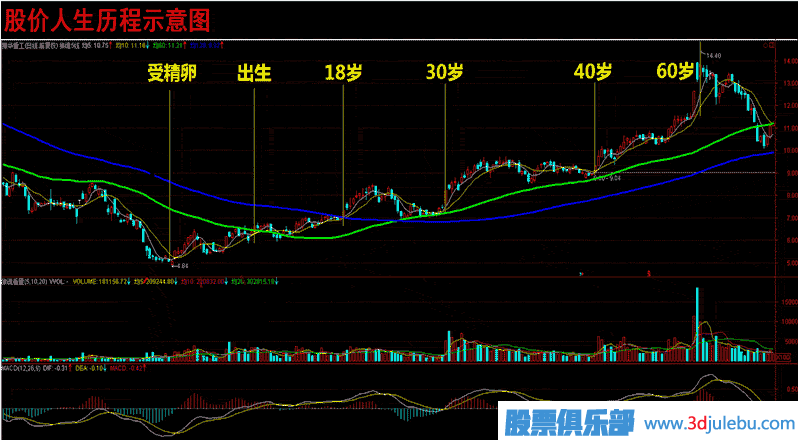 5、經(jīng)過第二波的上漲和調(diào)整后,股價迎來最后的瘋狂拉升,這時人氣極度旺盛,陽氣十足,猶如40-60歲的成功人士一樣,在經(jīng)歷了幾十年的摸爬滾打后,此時人脈廣達、官運亨通、財富一方、所向披靡,整個人生走向巔峰。但伴之而來的是年紀的增大和體力的不支,全身各個器官不斷老化、衰竭。人生已至幕年,一生所創(chuàng)造的所有榮譽和輝煌都將伴隨著生命的消失而灰飛煙滅。股價猶如流星般大幅下挫,開始它新的輪回。