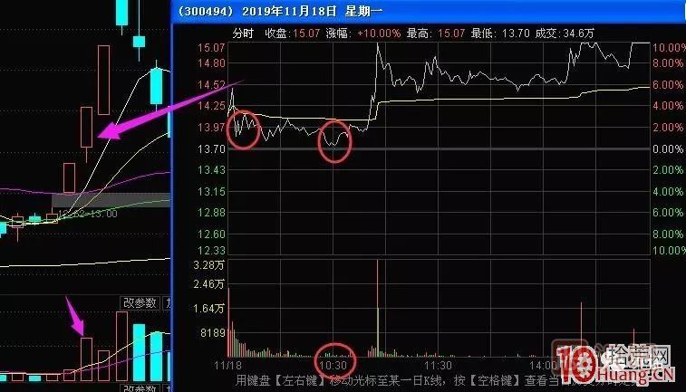 第二種:開盤沖高——回落破均價線(回踩開盤價)——10點前上板。