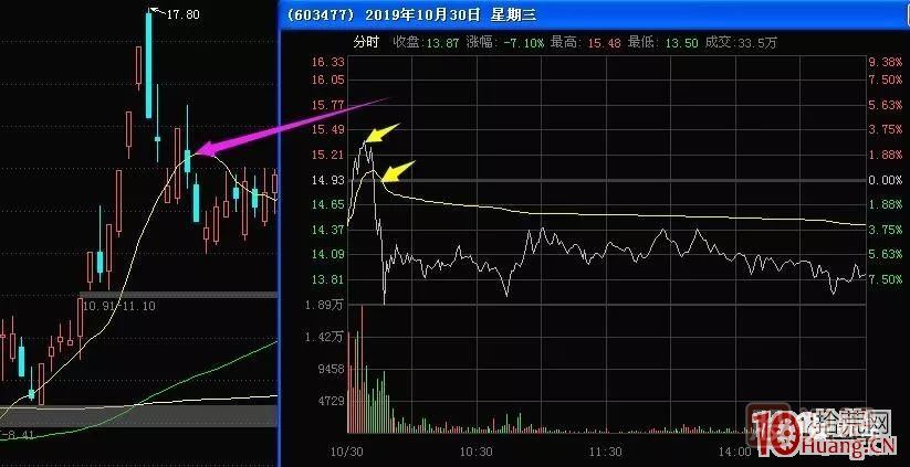 如青海華鼎。雖然K線沿著10日線爬升,但分時(shí)表現(xiàn)顯弱,有沖高卻沒有沖板跡象,則日內(nèi)找賣點(diǎn)。