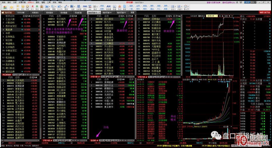 左三,左四,最上方都是漲跌幅排名搭配漲跌速,這個(gè)是用來(lái)看個(gè)股及時(shí)漲跌的,上升還是跳水。左三下面是自選股,當(dāng)天想交易的票,左四下面是<短線精靈>,同花順一個(gè)指標(biāo),看漲跌停板和炸板方便。