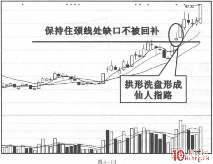 結(jié)果證明,那天的極強勢拱形洗盤是一個“仙人指路”走勢,后市不僅回補了上影線,而且還繼續(xù)創(chuàng)出新高。這是近年來主力莊家一種新型的洗盤方式。
