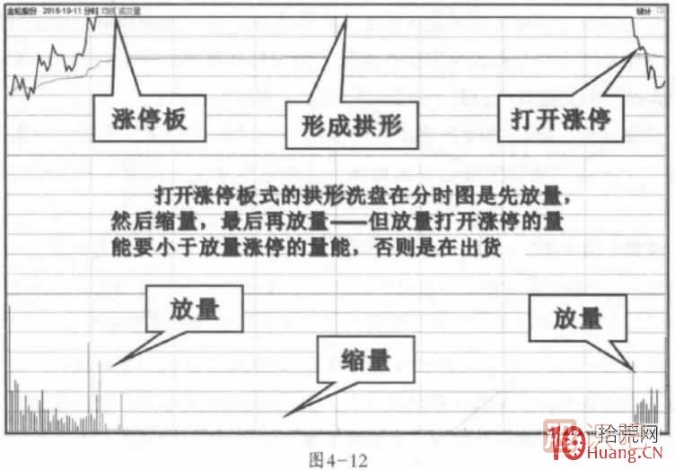 還有一種極強式的拱形洗盤,就是攻上漲停板后再打開,然后再封上,請看圖4-12.