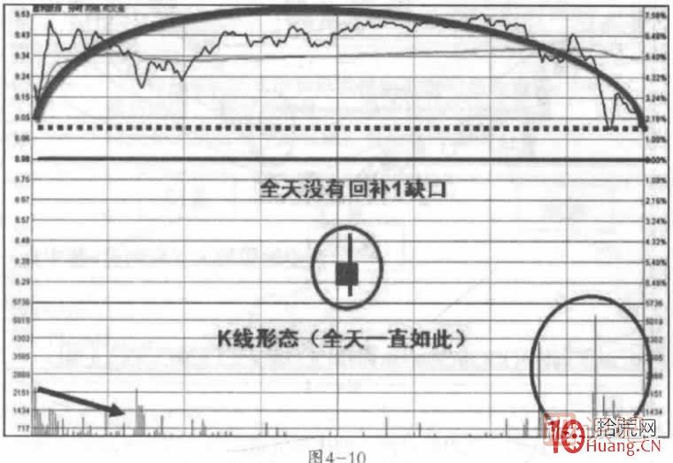 這種紅盤區(qū)的拱形洗盤與綠盤區(qū)的不同點在于:此種拱形全天基本沒量,到了最后半小時由于莊家的突然打壓才放出量來(見圖4-10中的圓圈所示),這里的“量”不是主力的而是市場的。主力只是在打壓時放出一股量來就完成任務(wù)丫,散戶們在看到主力放量“出貨”后會慌不擇路地跟隨拋掉自己手中的籌碼,他們想:反正這些籌碼大多數(shù)已經(jīng)獲利。還有一部分散戶是歷史套牢盤,現(xiàn)在基本上到了解套價,本來還想再等等看,看能不能反敗為勝來獲利。