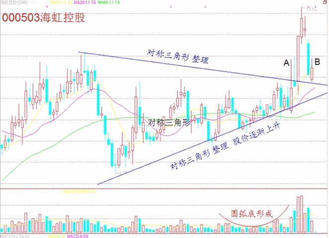這訣是說股票的長(zhǎng)時(shí)間盤整形態(tài)和未來變盤方向的。當(dāng)一只股票中線或者長(zhǎng)線盤整時(shí),其K線圖多會(huì)走出一個(gè)較大 的三角形,再接一個(gè)較小的三角形,有的長(zhǎng)線股可能走出大、中、小三個(gè)甚至是多個(gè)逐漸趨小的三角形,當(dāng)擠到最頂尖時(shí),就會(huì)變盤。如果先向上突破不成,就成了 假突破,必會(huì)引發(fā)一輪大砸盤;而如果尖端再次向下破位,一般會(huì)用多根連續(xù)的陰線向下挖出一個(gè)坑,而后則會(huì)一路上揚(yáng)。操作中,要注意假突破的判斷,以防追高 被套,而連續(xù)陰線挖坑則是長(zhǎng)線介入的最佳時(shí)機(jī),其后的漲幅一般會(huì)突破長(zhǎng)期整理的平臺(tái),不可賣出過早。
