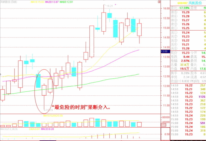 這 一訣是繼十四訣的進(jìn)一步說明。如果這根特大的陽線出現(xiàn)了長(zhǎng)長(zhǎng)的上影,尾盤有獲利盤涌出,(有時(shí)也是大盤的尾市突然變盤影響)上影超過了K線實(shí)體,或者至少 也有當(dāng)日升幅的三四個(gè)點(diǎn)以上,那么在分時(shí)線尾盤跳水收盤的一瞬間我則快速重倉(cāng)搶入。次日開盤后,會(huì)直沖前日高點(diǎn),或者再創(chuàng)新高。