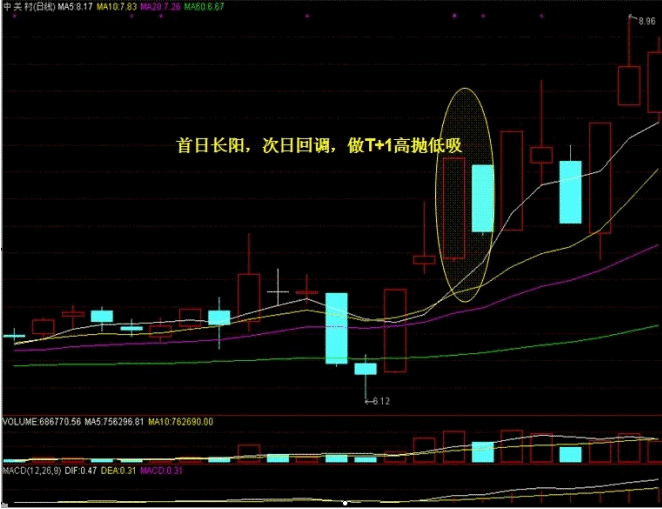 本訣的前半句是說首日長(zhǎng)陽線收盤時(shí)是否持倉(cāng)應(yīng)該謹(jǐn)慎對(duì)待。這在訣十四、十五中已經(jīng)詳細(xì)說明了。后半句說次日的走勢(shì)將會(huì)是大幅震蕩,操作上應(yīng)該以做差為上策,次日早盤繼續(xù)沖高則賣出,早盤大幅回調(diào),則堅(jiān)定買入做差。