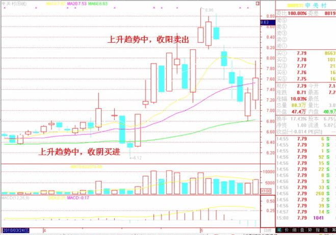 這一口訣與第一訣有點(diǎn)類似,就是講逆市而動(dòng)的道理,第一訣是說短線的,第二訣是說中線的。即,買時(shí),選則K線收陰線時(shí)買;賣時(shí),選則K線收陽線時(shí)賣。