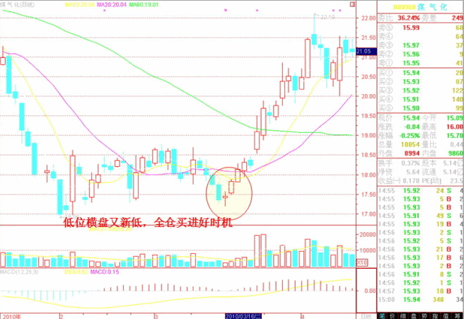 這一口訣是對(duì)口訣三的進(jìn)一步具體化說明,是描述訣三中的一種最佳時(shí)機(jī)。股價(jià)和大盤常常是高位盤整后還有新 高,低位盤整后又創(chuàng)新低,因此說,要等待變盤的方向明朗后再開始。如高位橫盤后向上變盤,再創(chuàng)新高,這是賣出的最佳時(shí)機(jī);而低位橫盤整理之后再向下變盤, 這將是滿倉(cāng)買入的最佳時(shí)機(jī)。