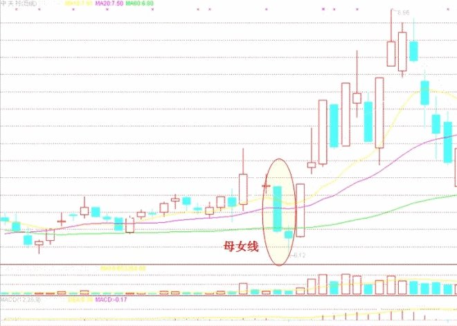 所謂“母女”線,是指權(quán)證,多為認(rèn)沽權(quán)證走出的一種特別的標(biāo)志性形態(tài)。當(dāng)沽權(quán)上漲數(shù)日到高點(diǎn)時(shí),因無正股走勢(shì)支撐,不同于購(gòu)權(quán),會(huì)突然大跌,跌出一根大陰 線和一根小陰線,大陰線實(shí)體長(zhǎng),跌幅在八九個(gè)點(diǎn),以至于十幾個(gè)點(diǎn)之上,小陰線實(shí)體小,通常有很短的上下影,因是大小兩陰,故狀如“母”攜“女”。此種形態(tài) 也常出現(xiàn)在下跌通道中。其后走勢(shì)會(huì)以兩三個(gè)小陽線的形態(tài)向上反彈,反彈到大陰線的一半左右,或者到10日均線(弱勢(shì)的到5日均線)后,再次向下調(diào)整。操作 上宜在“女”線的腳部買入,待反彈到10日(或5日)均線壓力位處賣出??偟恼f來,這種形態(tài)操作的利潤(rùn)空間不大,但比較安全。