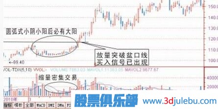 圓弧形態(tài)一般出現(xiàn)在調整后或者橫盤整理挖坑后走出的圖形,從技術形態(tài)上看有二個特別現(xiàn)象是,一個是在圓弧底位會出現(xiàn)密集交易區(qū),(密集交易就是說持續(xù)幾天的K線長短差不多),二是均量萎縮,但是陽線是有帶量的,陰線非??s量。但在圓弧快形成階段量能會逐步放大,這個階段為初步買入信號出現(xiàn),一旦放量突破前弧口處為黃金介入點,如果你錯過這一點位,那么一般突破后都會有一個回落過程,當然回落不破支撐線可再一次介入信號出現(xiàn)。如果這一次買入信號錯過你必將后悔,因為后面少有機會介入了,不管后市怎么調整也難回到前面這個價位。一般出現(xiàn)類似圓弧圖形的,在后期都會走一大波行情出來,圓弧越大,主力吸籌越多,后市走向越高。