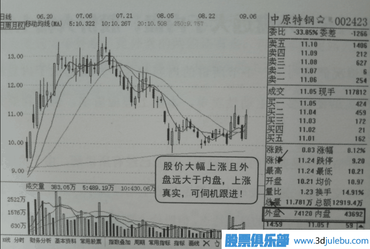 第二種情況則表現(xiàn)為外盤遠大于內(nèi)盤,股價出現(xiàn)大幅上漲,說明資金在真金白銀地介入,最終必將導致主力的倉籌碼公式選股答疑外盤遠大于內(nèi)盤加速買入形態(tài)位增加,既然主力敢于增加倉位,那后市看漲概率非常之大,伺機介入短線盈利應(yīng)該不菲。其盤口特點表現(xiàn)為:主動性買單前赴后繼,股價在大量買單的作用下不斷攀升,股價表現(xiàn)為走勢連續(xù),上漲帶量而盤整縮量,同時量比通常都比較大,如果確定為此類盤口,那就應(yīng)該大膽介入。