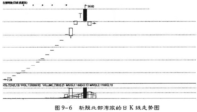 對于普通個(gè)股而言股價(jià)的漲停是很正常的,但是對于新股而言其第一個(gè)漲停板就是最好的操作時(shí)機(jī)。無論股價(jià)后期是否可以再度漲停,至少明天會(huì)出現(xiàn)慣性高開,圖9-6所示為2105年3月26日上市的北部灣旅游,盡管上市后連拉了13個(gè)漲停,但打開漲停后,走勢依然強(qiáng)勁,只要搶進(jìn)就能賺錢。