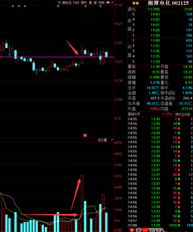 如果具備以上條件說明,大陽(yáng)線的當(dāng)天是主力的主要成本區(qū),而且在高位放量,證明主力成本較高。那么我們可以大概在集中放量的價(jià)位畫一個(gè)線,如示例圖的紫色線,這根線就是主力的成本線。一般操盤手不怎么喜歡自己賬面浮虧,所以一般會(huì)在收盤前把價(jià)位拉回去。