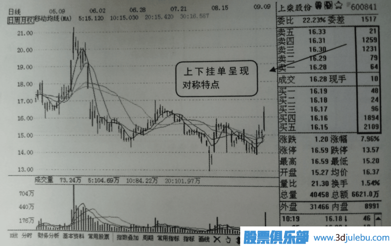 如圖1所示是上柴股份(600841) 的日K線界面,圖中顯示該股當(dāng)天漲幅已經(jīng)接近8%,且買賣檔出現(xiàn)較為明顯的對稱式蜂窩掛單特點,因此可說明股價當(dāng)天漲停的概率偏大。