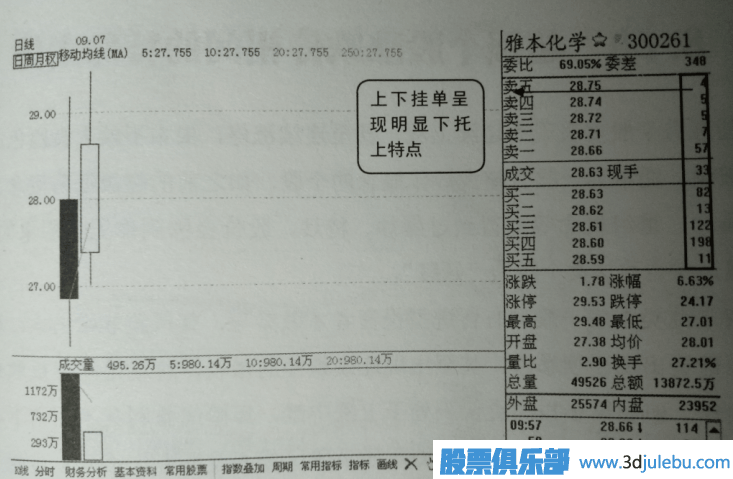 如圖5所示是雅本化學(xué)(300261) 的日k線界面,圖中顯示該股屬于剛上市第二天的新股,且為創(chuàng)業(yè)板,在當(dāng)時炒新情緒高