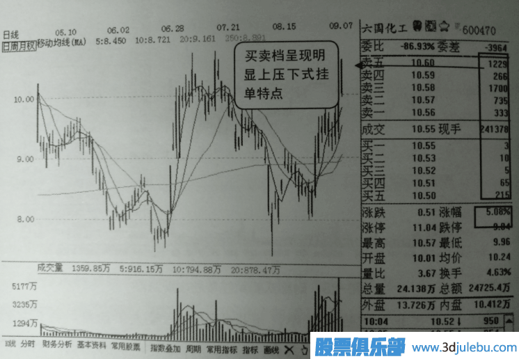 如圖3所示是六國化工的K線界面,圖中顯示該股當(dāng)天當(dāng)時已經(jīng)上漲5個百分點,且外盤比內(nèi)盤大得較多,已知當(dāng)天農(nóng)藥化肥板塊領(lǐng)漲,另外可觀察到當(dāng)時的買賣檔已經(jīng)出現(xiàn)非常明顯的上壓下式非對稱蜂窩掛單,說明該股當(dāng)天法停概率很大,操作上可適當(dāng)追入。