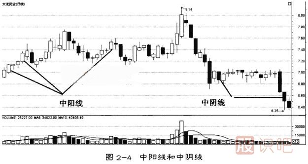 比小陽線與小陰線的實體再放大些的是中陽線與中陰線,其開盤價與收盤價的波動范圍更大(如圖2-4)