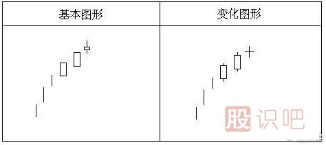 1、基本圖形:強(qiáng)弩之末是發(fā)生在上升趨勢末端的三根K線組合形態(tài),圖形如下: