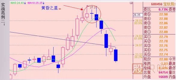 600456,寶鈦股份,近幾日走勢(shì)圖,大家看在黃昏之星頭部形態(tài)出現(xiàn)的同時(shí)攻擊線拐頭向下,此時(shí)短線投資者應(yīng)作減倉(cāng)處理,隨后股票出現(xiàn)了較大跌幅,上周五操盤線拐頭已經(jīng)向下,此時(shí)應(yīng)作再次減倉(cāng)或出局處理。
