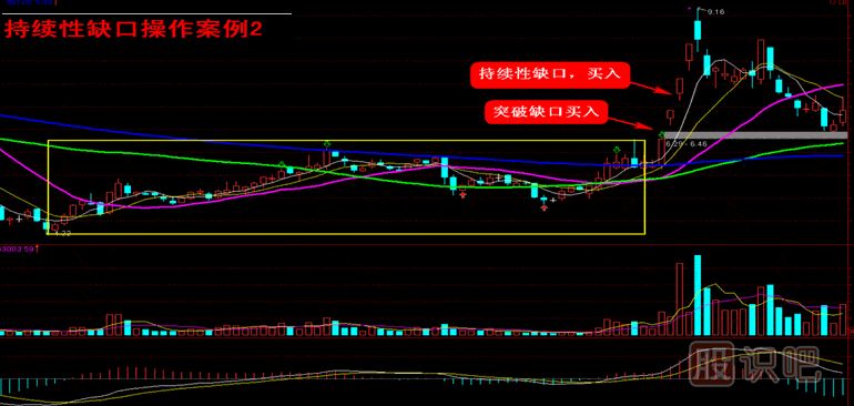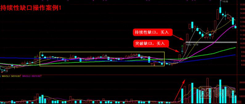 就持續(xù)性缺口的操作而言,投資者可以在出現(xiàn)持續(xù)性缺口后做出買入或者賣出決策,當(dāng)方向向上時(shí)買入,此時(shí)同樣需要成交量的放大來對價(jià)格進(jìn)行驗(yàn)證(漲停板模式除外);反之,方向向下時(shí)賣出。