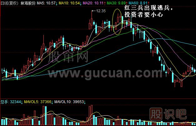 如果紅三兵的第三根陽(yáng)線(xiàn)突然變得實(shí)體很小,則可稱(chēng)為出現(xiàn)了逃兵,雖然前面兩根陽(yáng)線(xiàn)代表多頭繼續(xù)進(jìn)攻的意愿,但第三根K線(xiàn)表明做多的力量已經(jīng)跟不上,股價(jià)隨時(shí)可能出現(xiàn)回落,特別是在漲升一程之后,此時(shí)投資者要考慮先賣(mài)出。
